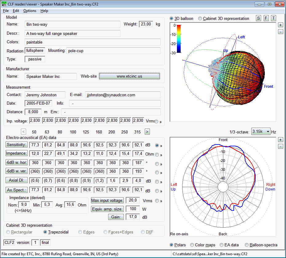 CLF files are distributed in a secure binary format. The data can be viewed with the free CLF viewer which you can download. This software will open CLF files and display the data both numerically and graphically. A typical screen capture is shown below. The viewer allows directivity data to be shown as colored 3D balloons, colored 3D spheres, as horizontal and vertical polars or as balloon spectra. Other frequency dependent data, such as impedance, Q etc. can be plotted graphically. Many data items may have further explaning info and a dedicated pdf or text info-file may be included.